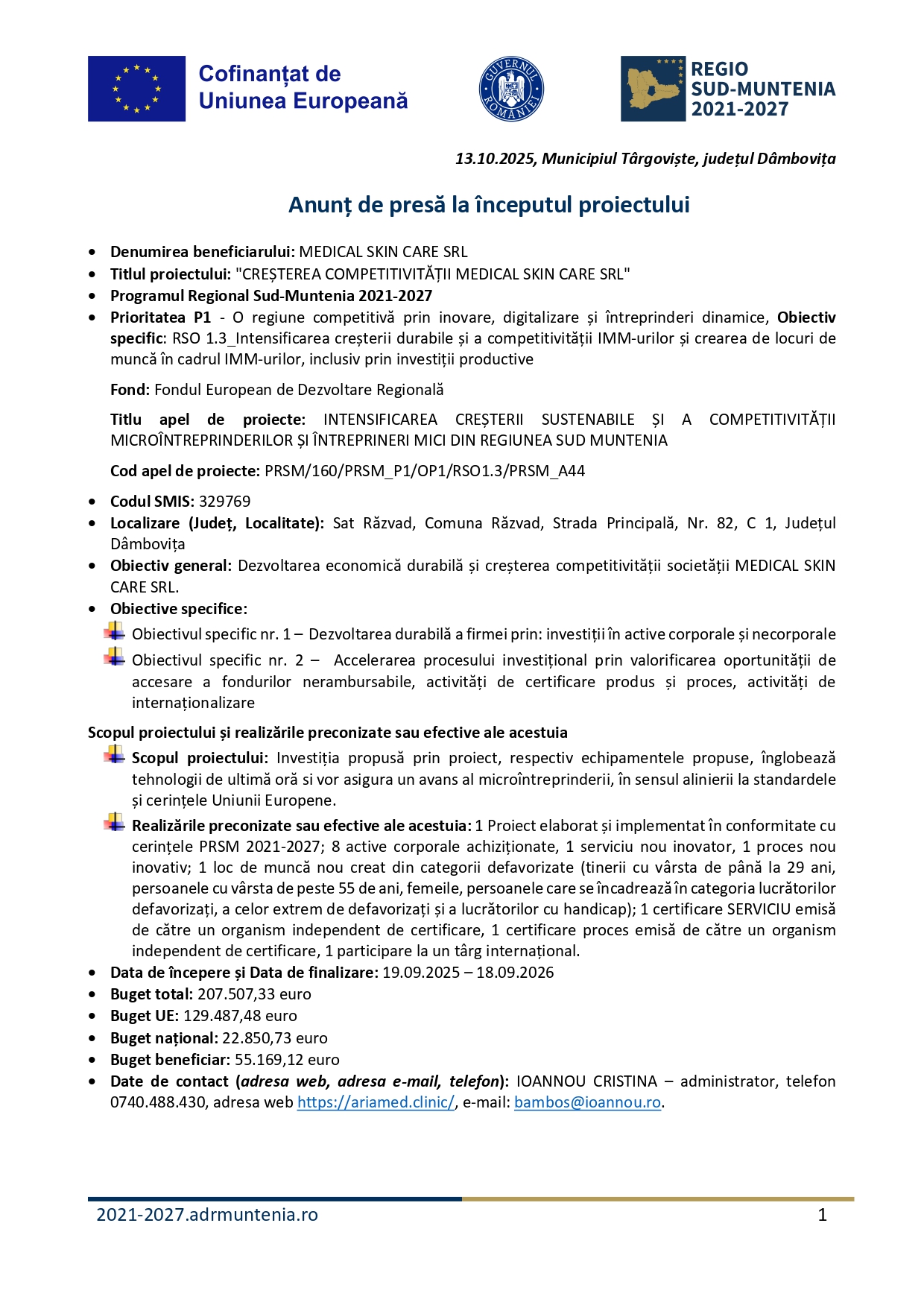 Anunţuri Updated: 13 octombrie 2025 Anunț de presă la începutul proiectului „CREȘTEREA COMPETITIVITĂȚII MEDICAL SKIN CARE SRL” By admin 13 octombrie 2025 72 0 Acțiune FacebookTwitterPinterestVKWhatsAppImprimareEmailViberCopy URL Publicitate Citeşte şi SocialŞtefan Khalil - 13 octombrie 2025Sute de absolvenți la Bursa Locurilor de Muncă Cultură - ÎnvățământAndrei Vasiliu - 13 octombrie 2025„Școala părinților”, proiect lansat de Poliție, Salvați Copiii și Inspectoratul Școlar ActualităţiŞtefan Khalil - 13 octombrie 2025Investiții importante în infrastructura educațională la Târgoviște Socialadmin - 13 octombrie 2025Sprijin bisericesc pentru Grădinița Sagricom din Târgoviște EconomicAndrei Vasiliu - 13 octombrie 2025Problema angajatorilor străini, explicată de ITM și Biroul pentru Imigrări Acțiune FacebookTwitterPinterestVKWhatsAppImprimareEmailViberCopy URL Articolul precedentÎntreruperi de energie electrică programateArticolul următorEditorial sportiv. Test de maturitate Publicitate LĂSAȚI UN MESAJ Renunțați la răspuns Comentariu: Vă rugăm să introduceți comentariul dvs.! Nume:* Introduceți aici numele dvs. Email:* Ați introdus o adresă de e-mail incorectă! Vă rugăm să introduceți adresa dvs. de e-mail aici Website: Salvați numele meu, adresa de e-mail și site-ul web în acest browser pentru data viitoare i comentariu. Ultimele ştiri SocialŞtefan Khalil - 13 octombrie 2025Sute de absolvenți la Bursa Locurilor de MuncăAgenția Județeană pentru Ocuparea Forței de Muncă Dâmbovița, în parteneriat cu Consiliul Județean Dâmbovița, a organizat vineri, 10 octombrie,... Cultură - Învățământ „Școala părinților”, proiect lansat de Poliție, Salvați Copiii și Inspectoratul Școlar Andrei Vasiliu - 13 octombrie 2025 Actualităţi Investiții importante în infrastructura educațională la Târgoviște Ştefan Khalil - 13 octombrie 2025 Social Sprijin bisericesc pentru Grădinița Sagricom din Târgoviște admin - 13 octombrie 2025 Economic Problema angajatorilor străini, explicată de ITM și Biroul pentru Imigrări Andrei Vasiliu - 13 octombrie 2025 Citeşte şi... Întreruperi de energie electrică programate Anunţuri admin - 13 octombrie 2025 ANUNȚ VÂNZARE TEREN PUCIOASA Anunţuri admin - 12 octombrie 2025 DISPOZIȚIE privind convocarea Consiliului Local Municipal Târgovişte în şedinţă extraordinară în ziua de 13.10.2025 Anunţuri admin - 10 octombrie 2025 Raid al poliției în aproape 150 de școli din Dâmbovița Anunţuri Andrei Vasiliu - 10 octombrie 2025