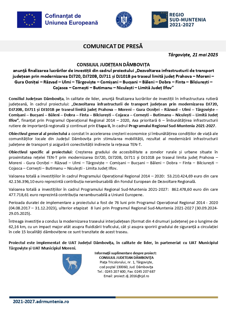 AnunţuriComunicate Updated: 20 mai 2025 COMUNICAT DE PRESĂ privind finalizarea lucrărilor de investiții din cadrul proiectului „Dezvoltarea infrastructurii de transport județean prin modernizarea DJ720, DJ720B, DJ711 și DJ101B pe traseul limită județ Prahova – Moreni – Gura Ocniței – Răzvad – Ulmi – Târgoviște – Comișani – Bucșani – Băleni – Dobra – Finta – Bilciurești – Cojasca – Cornești – Butimanu – Niculești – Limită Județ Ilfov” By admin 21 mai 2025 303 0 Acțiune FacebookTwitterPinterestVKWhatsAppImprimareEmailViberCopy URL Publicitate Citeşte şi Comunicateadmin - 3 octombrie 2025Festivalul Național de Interpretare și Creație a Romanței „Crizantema de Aur”, ediția a 58-a, 16 – 18 Octombrie 2025 SportCostin Mihai - 3 octombrie 2025CSM Târgoviște, calificare simplă în semifinalele Cupei României SportCosmin Sava - 3 octombrie 2025Sorana Cîrstea, eliminată în turul 2 la Beijing SportCosmin Sava - 3 octombrie 2025Perioadă plină pentru CSȘ Târgoviște SportCostin Mihai - 3 octombrie 2025Sume uriașe achitate de Chindia Acțiune FacebookTwitterPinterestVKWhatsAppImprimareEmailViberCopy URL Articolul precedentUn vot… în doi periArticolul următorEditorial sportiv. O golgoază neserioasă Publicitate LĂSAȚI UN MESAJ Renunțați la răspuns Comentariu: Vă rugăm să introduceți comentariul dvs.! Nume:* Introduceți aici numele dvs. Email:* Ați introdus o adresă de e-mail incorectă! Vă rugăm să introduceți adresa dvs. de e-mail aici Website: Salvați numele meu, adresa de e-mail și site-ul web în acest browser pentru data viitoare i comentariu. Ultimele ştiri Comunicateadmin - 3 octombrie 2025Festivalul Național de Interpretare și Creație a Romanței „Crizantema de Aur”, ediția a 58-a, 16 – 18 Octombrie 2025Vă facem cunoscut că, în perioada 16-18 Octombrie 2025, se va desfăşura în municipiul Târgovişte, sub patronajul Comisiei Naţionale... Sport CSM Târgoviște, calificare simplă în semifinalele Cupei României Costin Mihai - 3 octombrie 2025 Sport Sorana Cîrstea, eliminată în turul 2 la Beijing Cosmin Sava - 3 octombrie 2025 Sport Perioadă plină pentru CSȘ Târgoviște Cosmin Sava - 3 octombrie 2025 Sport Sume uriașe achitate de Chindia Costin Mihai - 3 octombrie 2025 Citeşte şi... Festivalul Național de Interpretare și Creație a Romanței „Crizantema de Aur”, ediția a 58-a, 16 – 18 Octombrie 2025 Comunicate admin - 3 octombrie 2025 Întreruperi de energie electrică programate Anunţuri admin - 29 septembrie 2025 Modernizare fermă zootehnică Anunţuri admin - 23 septembrie 2025 Întreruperi de energie electrică programate Anunţuri admin - 22 septembrie 2025