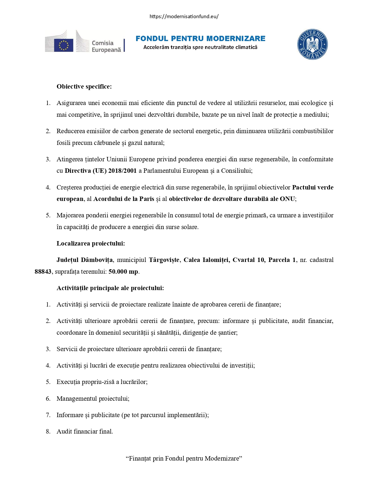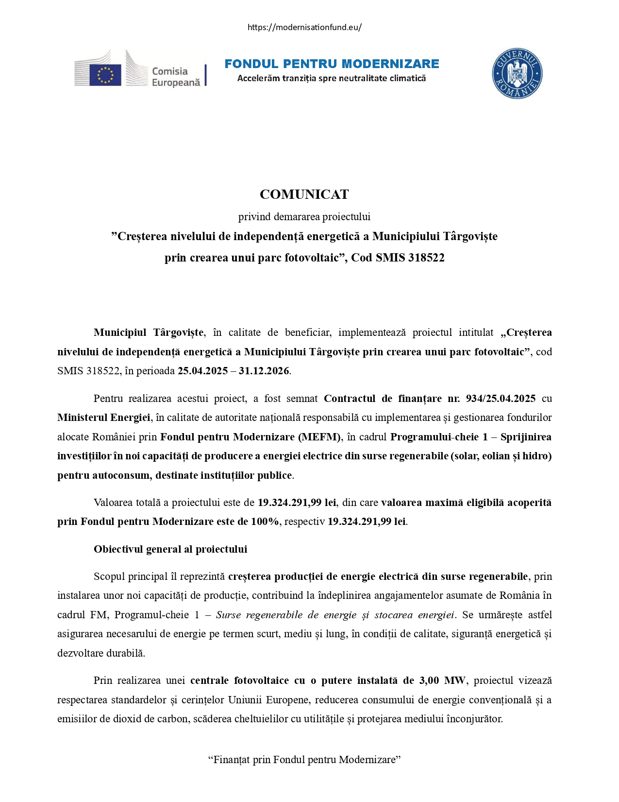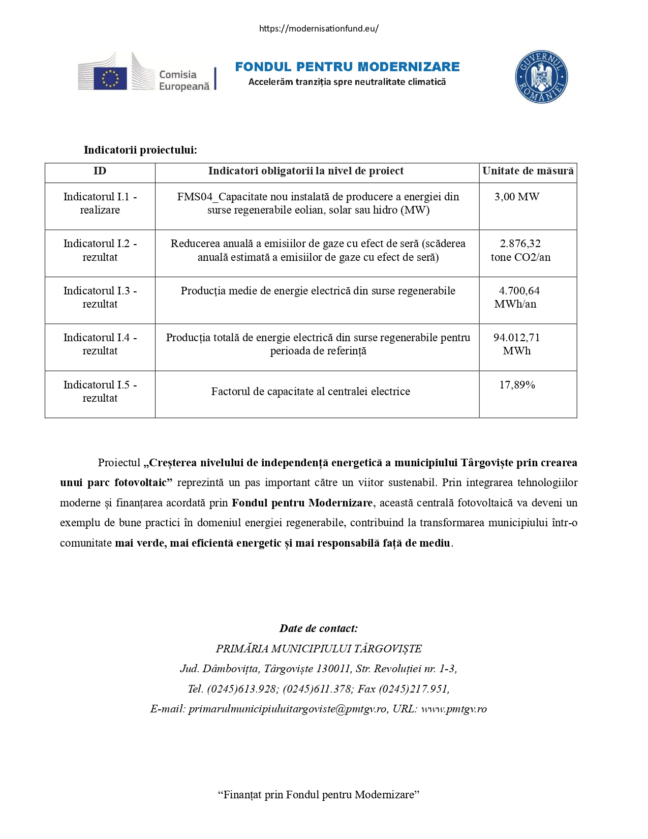 Anunţuri Updated: 19 mai 2025 COMUNICAT privind demararea proiectului ”Creșterea nivelului de independență energetică a Municipiului Târgoviște prin crearea unui parc fotovoltaic”, Cod SMIS 318522 By admin 19 mai 2025 292 0 Acțiune FacebookTwitterPinterestVKWhatsAppImprimareEmailViberCopy URL Publicitate Citeşte şi Comunicateadmin - 3 octombrie 2025Festivalul Național de Interpretare și Creație a Romanței „Crizantema de Aur”, ediția a 58-a, 16 – 18 Octombrie 2025 SportCostin Mihai - 3 octombrie 2025CSM Târgoviște, calificare simplă în semifinalele Cupei României SportCosmin Sava - 3 octombrie 2025Sorana Cîrstea, eliminată în turul 2 la Beijing SportCosmin Sava - 3 octombrie 2025Perioadă plină pentru CSȘ Târgoviște SportCostin Mihai - 3 octombrie 2025Sume uriașe achitate de Chindia Acțiune FacebookTwitterPinterestVKWhatsAppImprimareEmailViberCopy URL Articolul precedentVot masiv la prezidențialeArticolul următorRezultatul prezidenţialelor – o provocare vizând viitorul României Publicitate LĂSAȚI UN MESAJ Renunțați la răspuns Comentariu: Vă rugăm să introduceți comentariul dvs.! Nume:* Introduceți aici numele dvs. Email:* Ați introdus o adresă de e-mail incorectă! Vă rugăm să introduceți adresa dvs. de e-mail aici Website: Salvați numele meu, adresa de e-mail și site-ul web în acest browser pentru data viitoare i comentariu. Ultimele ştiri Comunicateadmin - 3 octombrie 2025Festivalul Național de Interpretare și Creație a Romanței „Crizantema de Aur”, ediția a 58-a, 16 – 18 Octombrie 2025Vă facem cunoscut că, în perioada 16-18 Octombrie 2025, se va desfăşura în municipiul Târgovişte, sub patronajul Comisiei Naţionale... Sport CSM Târgoviște, calificare simplă în semifinalele Cupei României Costin Mihai - 3 octombrie 2025 Sport Sorana Cîrstea, eliminată în turul 2 la Beijing Cosmin Sava - 3 octombrie 2025 Sport Perioadă plină pentru CSȘ Târgoviște Cosmin Sava - 3 octombrie 2025 Sport Sume uriașe achitate de Chindia Costin Mihai - 3 octombrie 2025 Citeşte şi... Întreruperi de energie electrică programate Anunţuri admin - 29 septembrie 2025 Modernizare fermă zootehnică Anunţuri admin - 23 septembrie 2025 Întreruperi de energie electrică programate Anunţuri admin - 22 septembrie 2025 Adio, Cosmin Oprea! Anunţuri admin - 21 septembrie 2025