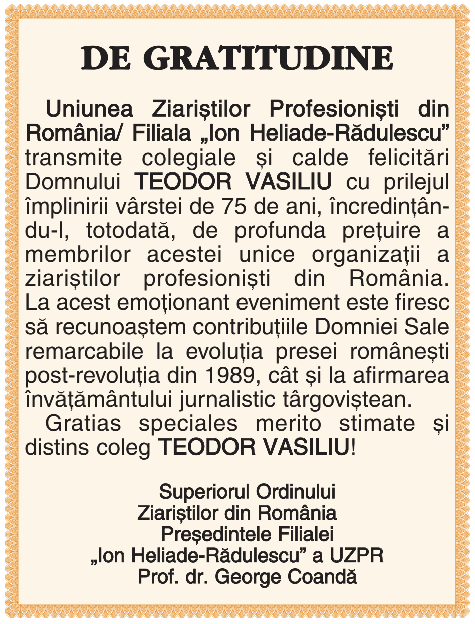 Uniunea Ziariștilor Profesioniști din România/ Filiala „Ion Heliade-Rădulescu” transmite colegiale și calde felicitări Domnului TEODOR VASILIU cu prilejul împlinirii vârstei de 75 de ani, încredințându-l, totodată, de profunda prețuire a membrilor acestei unice organizații a ziariștilor profesioniști din România. La acest emoționant eveniment este firesc să recunoaștem contribuțiile Domniei Sale remarcabile la evoluția presei românești post-revoluția din 1989, cât și la afirmarea învățământului jurnalistic târgoviștean.