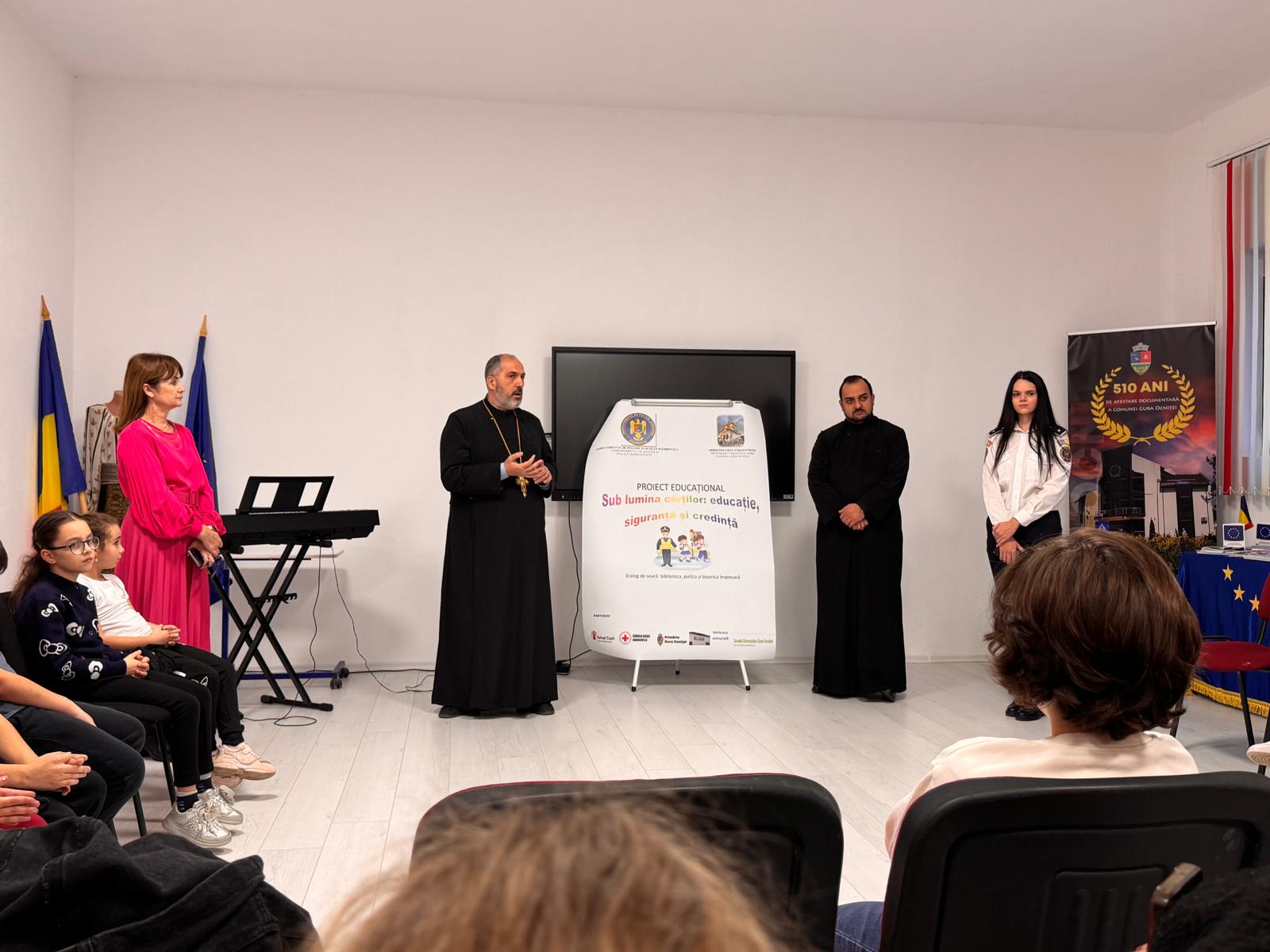 La Biblioteca Comunei Gura Ocniței, a avut loc, miercuri, 12 noiembrie 2025, cu bincuvântarea Înaltpreasfințitului Părinte Arhiepiscop și Mitropolit Nifon, lansarea proiectului „Sub lumina cărților: educație, siguranță și credință” – un dialog între Bibliotecă, Poliție și Biserică, la inițiativa Parohiei Gura Ocniței. O acțiune menită să aducă împreună Biserica, autoritățile locale, școala, familia și Poliția, în sprijinul copiilor și al comunității.