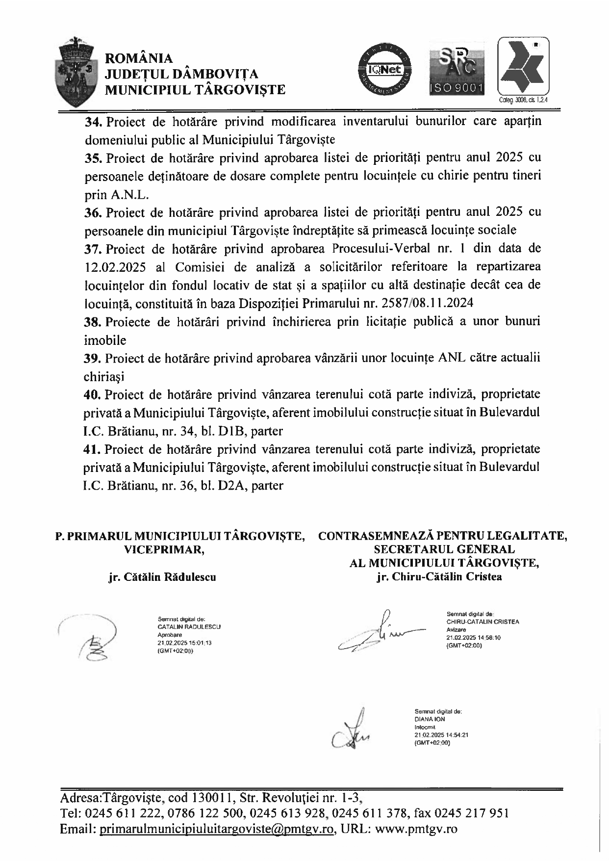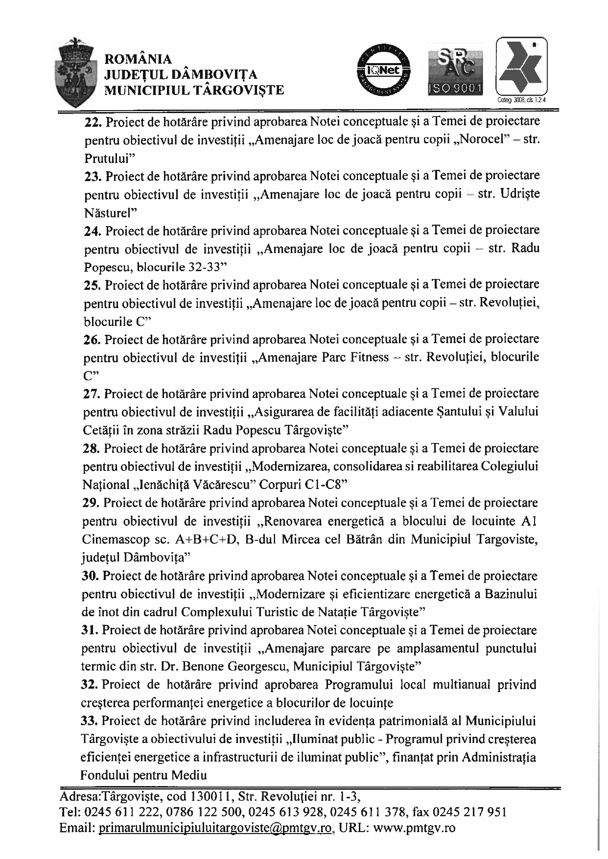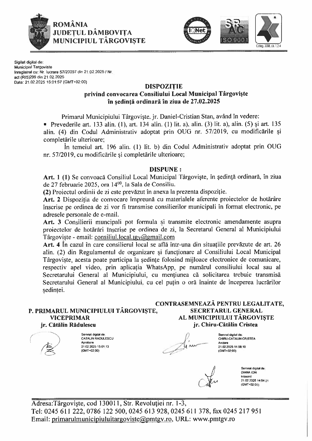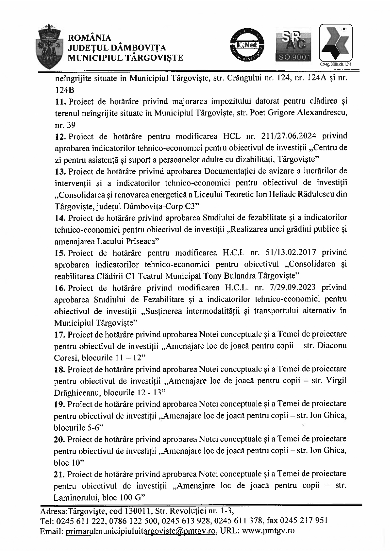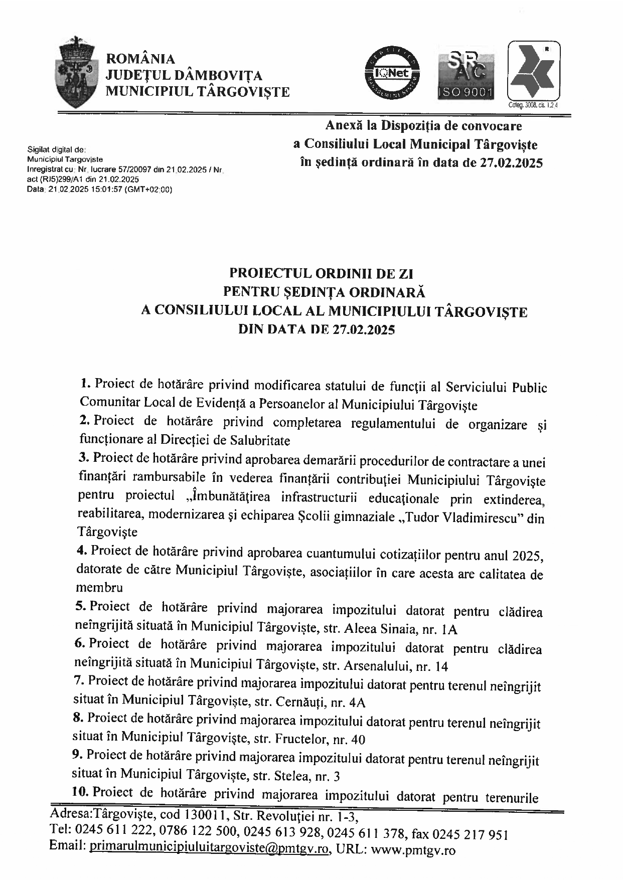 Anunţuri Updated: 25 februarie 2025 DISPOZIŢIE privind convocarea Consiliului Local Municipal Târgovişte în şedinţă ordinară în ziua de 27.02.2025 By admin 25 februarie 2025 357 0 Acțiune FacebookTwitterPinterestVKWhatsAppImprimareEmailViberCopy URL Publicitate Citeşte şi Comunicateadmin - 3 octombrie 2025Festivalul Național de Interpretare și Creație a Romanței „Crizantema de Aur”, ediția a 58-a, 16 – 18 Octombrie 2025 SportCostin Mihai - 3 octombrie 2025CSM Târgoviște, calificare simplă în semifinalele Cupei României SportCosmin Sava - 3 octombrie 2025Sorana Cîrstea, eliminată în turul 2 la Beijing SportCosmin Sava - 3 octombrie 2025Perioadă plină pentru CSȘ Târgoviște SportCostin Mihai - 3 octombrie 2025Sume uriașe achitate de Chindia Acțiune FacebookTwitterPinterestVKWhatsAppImprimareEmailViberCopy URL Articolul precedentLucrările pe DN71 Răcari-Târgoviște, în faza defrișărilorArticolul următorCea de-a 44-a Sesiune Ordinară a Comitetului Executiv al Federației Mondiale a Cluburilor și Asociațiilor pentru UNESCO (WFUCA) Publicitate LĂSAȚI UN MESAJ Renunțați la răspuns Comentariu: Vă rugăm să introduceți comentariul dvs.! Nume:* Introduceți aici numele dvs. Email:* Ați introdus o adresă de e-mail incorectă! Vă rugăm să introduceți adresa dvs. de e-mail aici Website: Salvați numele meu, adresa de e-mail și site-ul web în acest browser pentru data viitoare i comentariu. Ultimele ştiri Comunicateadmin - 3 octombrie 2025Festivalul Național de Interpretare și Creație a Romanței „Crizantema de Aur”, ediția a 58-a, 16 – 18 Octombrie 2025Vă facem cunoscut că, în perioada 16-18 Octombrie 2025, se va desfăşura în municipiul Târgovişte, sub patronajul Comisiei Naţionale... Sport CSM Târgoviște, calificare simplă în semifinalele Cupei României Costin Mihai - 3 octombrie 2025 Sport Sorana Cîrstea, eliminată în turul 2 la Beijing Cosmin Sava - 3 octombrie 2025 Sport Perioadă plină pentru CSȘ Târgoviște Cosmin Sava - 3 octombrie 2025 Sport Sume uriașe achitate de Chindia Costin Mihai - 3 octombrie 2025 Citeşte şi... Întreruperi de energie electrică programate Anunţuri admin - 29 septembrie 2025 Modernizare fermă zootehnică Anunţuri admin - 23 septembrie 2025 Întreruperi de energie electrică programate Anunţuri admin - 22 septembrie 2025 Adio, Cosmin Oprea! Anunţuri admin - 21 septembrie 2025