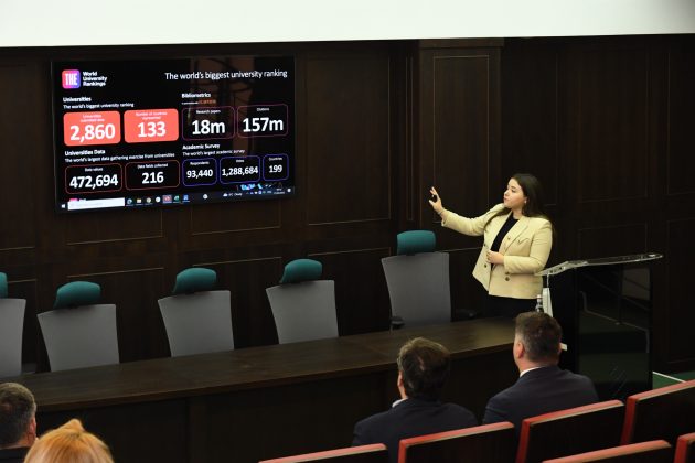 Anna Orlova, Director Regional al Times Higher Education pentru Europa și Regatul Unit, a susținut o prezentare despre metodologia și indicatorii-cheie ai World University Rankings, explicând impactul acestor clasificări asupra vizibilității și recunoașterii instituționale. Totodată, a evidențiat importanța raportării riguroase a datelor academice și a colaborărilor internaționale pentru îmbunătățirea poziționării universităților în clasamente.