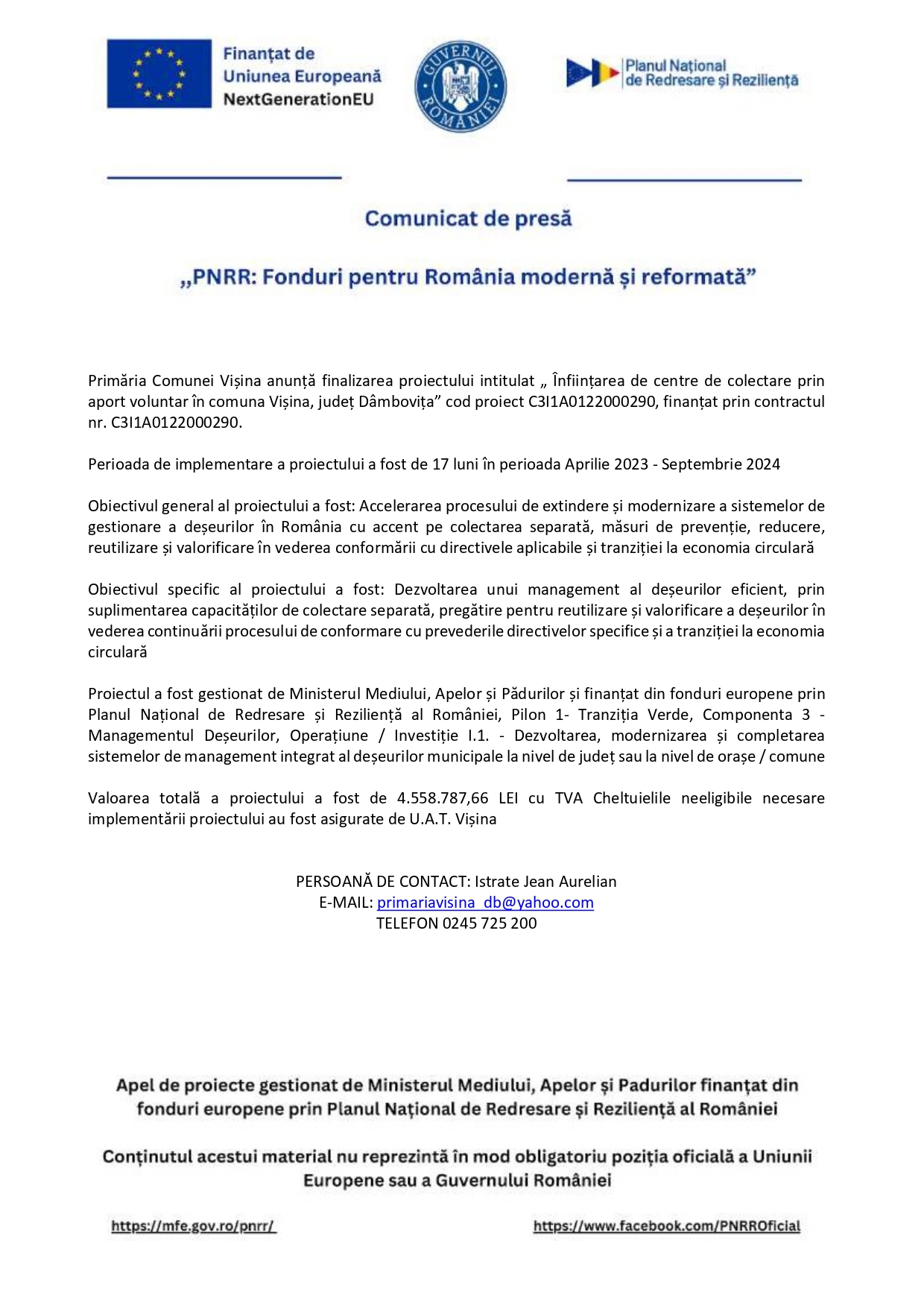 Comunicate Updated: 28 noiembrie 2025 Finalizarea proiectului „Înființare de centre de colectare prin aport voluntar în comuna Vișina, județ Dâmbovița” Comunicat de presă By admin 20 septembrie 2025 64 0 Acțiune FacebookTwitterPinterestVKWhatsAppImprimareEmailViberCopy URL Publicitate Citeşte şi SportCostin Mihai - 27 ianuarie 2026Marius Pavel a rupt colaborarea cu Ciprian Iugulescu SportCosmin Sava - 27 ianuarie 2026Baschet (m). CSU Târgoviște, a doua victorie în play-off SportCosmin Sava - 27 ianuarie 2026Baschet (f). Victorie clară la Cluj SportCostin Mihai - 27 ianuarie 2026Prezență la Cursul Național de Perfecționare și Licențiere Karate SportVasile Neagu - 27 ianuarie 2026Editorial sportiv. Se demolează un templu Acțiune FacebookTwitterPinterestVKWhatsAppImprimareEmailViberCopy URL Articolul precedent„Extindere și realizare rețea de canalizare pe strada Crângului – DN 72A din Municipiul Târgoviște, Județul Dâmbovița“Articolul următorOmagierea Patrimoniului European la Muzeul „Casa Romanței” Publicitate LĂSAȚI UN MESAJ Renunțați la răspuns Comentariu: Vă rugăm să introduceți comentariul dvs.! Nume:* Introduceți aici numele dvs. Email:* Ați introdus o adresă de e-mail incorectă! Vă rugăm să introduceți adresa dvs. de e-mail aici Website: Salvați numele meu, adresa de e-mail și site-ul web în acest browser pentru data viitoare i comentariu. Ultimele ştiri SportCostin Mihai - 27 ianuarie 2026Marius Pavel a rupt colaborarea cu Ciprian IugulescuPuțini ar fi crezut că noul președinte al Chindiei, Marius Pavel, va renunța la oamenii care au condus clubul... Sport Baschet (m). CSU Târgoviște, a doua victorie în play-off Cosmin Sava - 27 ianuarie 2026 Sport Baschet (f). Victorie clară la Cluj Cosmin Sava - 27 ianuarie 2026 Sport Prezență la Cursul Național de Perfecționare și Licențiere Karate Costin Mihai - 27 ianuarie 2026 Sport Editorial sportiv. Se demolează un templu Vasile Neagu - 27 ianuarie 2026 Citeşte şi... COMUNICAT DE PRESĂ: „Achiziție microbuze noi electrice pentru școlile din județul Dâmbovița” Anunţuri admin - 30 decembrie 2025 Anunț de finalizare implementare proiect „ÎNFIINȚARE CENTRU DE ZI PENTRU PERSOANE VÂRSTNICE ÎN COMUNA CORNEȘTI” Anunţuri admin - 16 decembrie 2025 Bienala Naţională de Gravură „Gabriel Popescu” și-a desemnat câștigătorii Actualităţi admin - 16 decembrie 2025 Ziarul News marchează 5 ani de excelență în presă și responsabilitate socială Actualităţi admin - 15 decembrie 2025