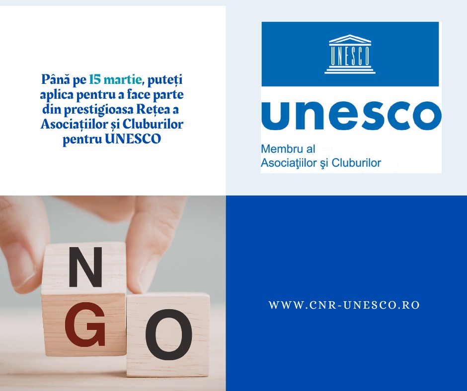 Comisia Națională a României pentru UNESCO (CNR-UNESCO) anunță deschiderea procesului de selecție și desemnare a Asociațiilor și Cluburilor pentru UNESCO pentru un nou mandat de 3 ani, în perioada 2026-2029.