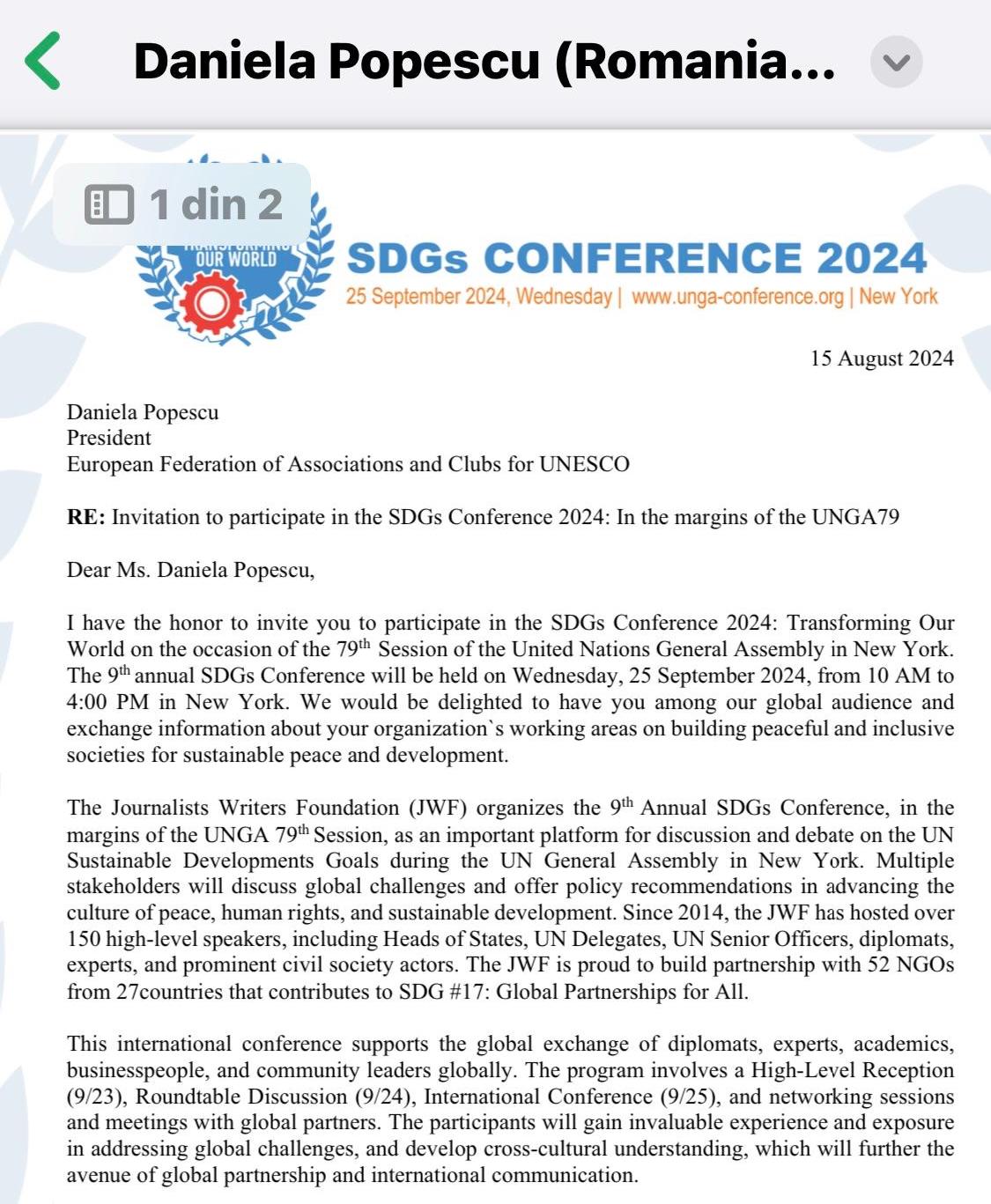 Daniela Popescu, vicepreședintă pentru Europa a Federației Mondiale a Asociațiilor și Cluburilor pentru UNESCO, participă în aceste zile, la New York, la lucrările Adunării Generale a ONU și ne-a transmis toate aceste informații, cu satisfacția unei uriașe realizări, pentru care organizațiile UNESCO militează de foarte mulți ani, așa cum se precizează în comunicatul de presă.