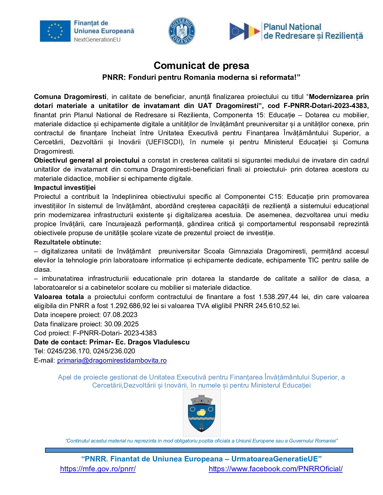 Anunţuri Updated: 20 august 2025 PNRR: Fonduri pentru România modernă și reformată! By admin 21 august 2025 172 0 Acțiune FacebookTwitterPinterestVKWhatsAppImprimareEmailViberCopy URL Publicitate Citeşte şi ActualităţiŞtefan Khalil - 3 octombrie 2025Noua bază sportivă a UVT, inaugurată oficial Cultură - Învățământadmin - 3 octombrie 2025Corala Catedralei din Târgoviște a cucerit podiumul ActualităţiRodica Vasiliu - 3 octombrie 2025Lecții rutiere pentru elevii de la Școala „Mihai Viteazul” EconomicŞtefan Khalil - 3 octombrie 2025Bază sportivă nouă, finalizată la Voinești Cultură - ÎnvățământRodica Vasiliu - 3 octombrie 2025Complexul Muzeal „Curtea Domnească” a lansat oferta de ateliere pentru elevi Acțiune FacebookTwitterPinterestVKWhatsAppImprimareEmailViberCopy URL Articolul precedentConstruire spălătorie auto de tip self-serviceArticolul următorGoluri multe și etapa a 3-a Publicitate LĂSAȚI UN MESAJ Renunțați la răspuns Comentariu: Vă rugăm să introduceți comentariul dvs.! Nume:* Introduceți aici numele dvs. Email:* Ați introdus o adresă de e-mail incorectă! Vă rugăm să introduceți adresa dvs. de e-mail aici Website: Salvați numele meu, adresa de e-mail și site-ul web în acest browser pentru data viitoare i comentariu. Ultimele ştiri ActualităţiŞtefan Khalil - 3 octombrie 2025Noua bază sportivă a UVT, inaugurată oficial*Investiția, derulată prin Compania Națională de Investiții, are o valoare de aproximativ 9 milioane de lei și include o... Cultură - Învățământ Corala Catedralei din Târgoviște a cucerit podiumul admin - 3 octombrie 2025 Actualităţi Lecții rutiere pentru elevii de la Școala „Mihai Viteazul” Rodica Vasiliu - 3 octombrie 2025 Economic Bază sportivă nouă, finalizată la Voinești Ştefan Khalil - 3 octombrie 2025 Cultură - Învățământ Complexul Muzeal „Curtea Domnească” a lansat oferta de ateliere pentru elevi Rodica Vasiliu - 3 octombrie 2025 Citeşte şi... Întreruperi de energie electrică programate Anunţuri admin - 29 septembrie 2025 Modernizare fermă zootehnică Anunţuri admin - 23 septembrie 2025 Întreruperi de energie electrică programate Anunţuri admin - 22 septembrie 2025 Adio, Cosmin Oprea! Anunţuri admin - 21 septembrie 2025