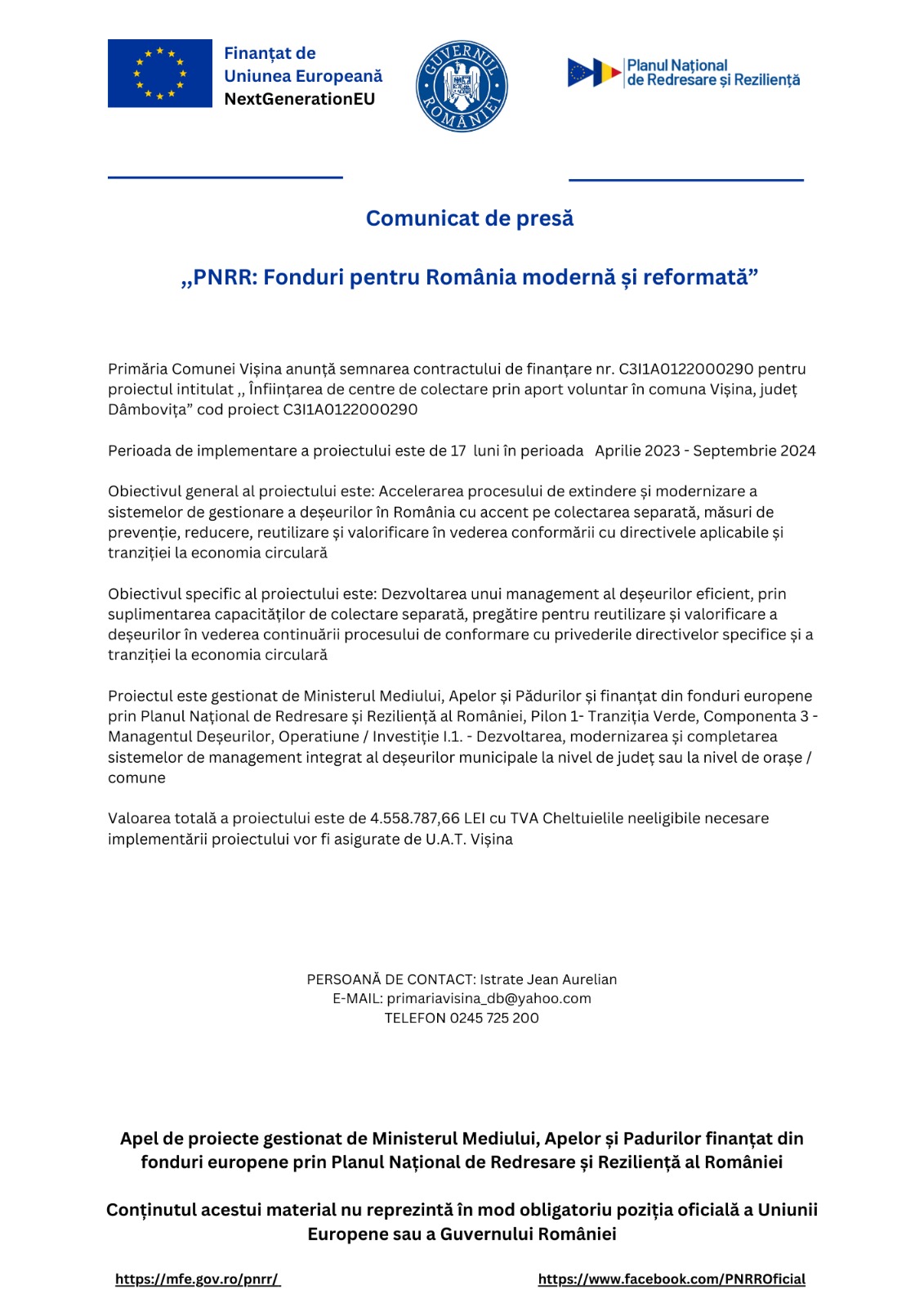 Anunţuri Updated: 1 iulie 2025 PNRR: Fonduri pentru România modernă și reformată By admin 1 iulie 2025 178 0 Acțiune FacebookTwitterPinterestVKWhatsAppImprimareEmailViberCopy URL Publicitate Citeşte şi ActualităţiŞtefan Khalil - 3 octombrie 2025Noua bază sportivă a UVT, inaugurată oficial Cultură - Învățământadmin - 3 octombrie 2025Corala Catedralei din Târgoviște a cucerit podiumul ActualităţiRodica Vasiliu - 3 octombrie 2025Lecții rutiere pentru elevii de la Școala „Mihai Viteazul” EconomicŞtefan Khalil - 3 octombrie 2025Bază sportivă nouă, finalizată la Voinești Cultură - ÎnvățământRodica Vasiliu - 3 octombrie 2025Complexul Muzeal „Curtea Domnească” a lansat oferta de ateliere pentru elevi Acțiune FacebookTwitterPinterestVKWhatsAppImprimareEmailViberCopy URL Articolul precedentBruxelles-ul extins: profesioniștii româniArticolul următor„Bătălia” de la Fieni, cu munteni și moldoveni Publicitate LĂSAȚI UN MESAJ Renunțați la răspuns Comentariu: Vă rugăm să introduceți comentariul dvs.! Nume:* Introduceți aici numele dvs. Email:* Ați introdus o adresă de e-mail incorectă! Vă rugăm să introduceți adresa dvs. de e-mail aici Website: Salvați numele meu, adresa de e-mail și site-ul web în acest browser pentru data viitoare i comentariu. Ultimele ştiri ActualităţiŞtefan Khalil - 3 octombrie 2025Noua bază sportivă a UVT, inaugurată oficial*Investiția, derulată prin Compania Națională de Investiții, are o valoare de aproximativ 9 milioane de lei și include o... Cultură - Învățământ Corala Catedralei din Târgoviște a cucerit podiumul admin - 3 octombrie 2025 Actualităţi Lecții rutiere pentru elevii de la Școala „Mihai Viteazul” Rodica Vasiliu - 3 octombrie 2025 Economic Bază sportivă nouă, finalizată la Voinești Ştefan Khalil - 3 octombrie 2025 Cultură - Învățământ Complexul Muzeal „Curtea Domnească” a lansat oferta de ateliere pentru elevi Rodica Vasiliu - 3 octombrie 2025 Citeşte şi... Întreruperi de energie electrică programate Anunţuri admin - 29 septembrie 2025 Modernizare fermă zootehnică Anunţuri admin - 23 septembrie 2025 Întreruperi de energie electrică programate Anunţuri admin - 22 septembrie 2025 Adio, Cosmin Oprea! Anunţuri admin - 21 septembrie 2025