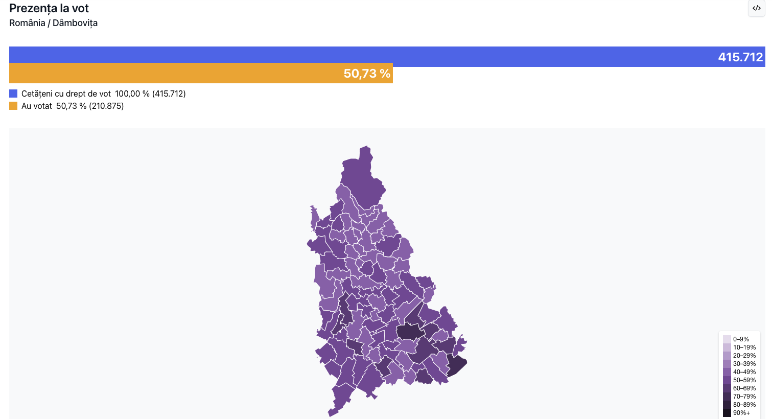 *Din cei 415.712 cetățeni înscriși pe listele electorale în județul Dâmbovița, mai mult de jumătate s-au prezentat la urne, cu o mobilizare mai mare în mediul rural (60,61%) comparativ cu mediul urban (39,39%)