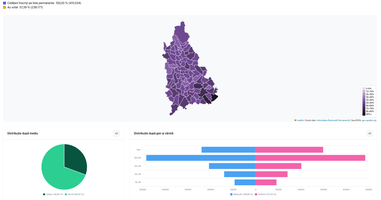 Distribuția pe medii arată o participare mai ridicată în zonele rurale, care au reprezentat 69,40% din totalul votanților, în timp ce mediul urban a adunat 30,60% din voturi. Acest raport confirmă trendul deja cunoscut în județ, unde mobilizarea este tradițional mai puternică în comune și sate.
