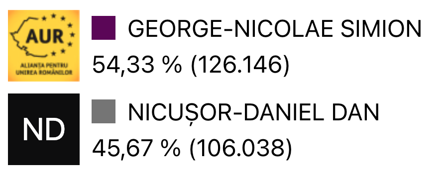 În județul Dâmbovița, potrivit datelor parțiale furnizate de Autoritatea Electorală Permanentă, candidatul AUR, George Simion, a obținut 54,33% din voturile valabil exprimate în județ (echivalentul a 126.146 voturi), în timp ce contracandidatul său, Nicușor Dan, a fost votat de 106.038 alegători, adică 45,67%.