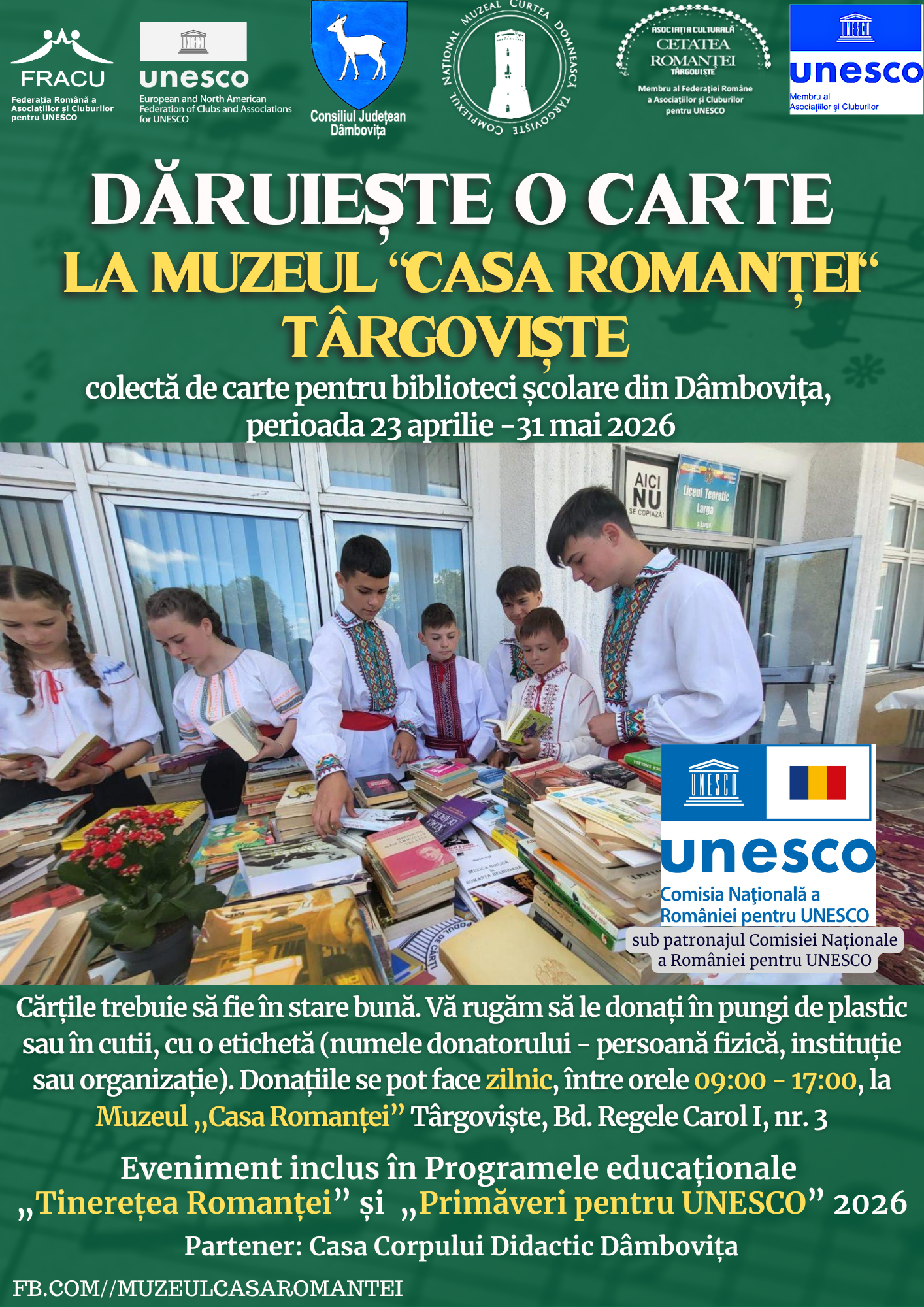 Evenimentul a marcat, totodată, lansarea în Târgoviște a proiectului „Dăruiește o carte”, o nobilă campanie de colectare de carte destinată bibliotecilor școlare din județul Dâmbovița, care se va desfășura în perioada 23 aprilie – 31 mai 2026. Organizatori au fost Asociația Culturală „Cetatea Romanței” Târgoviște, Federația Română a Asociațiilor și Cluburilor pentru UNESCO, împreună cu Complexul Național Muzeal „Curtea Domnească” Târgoviște.