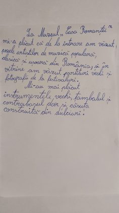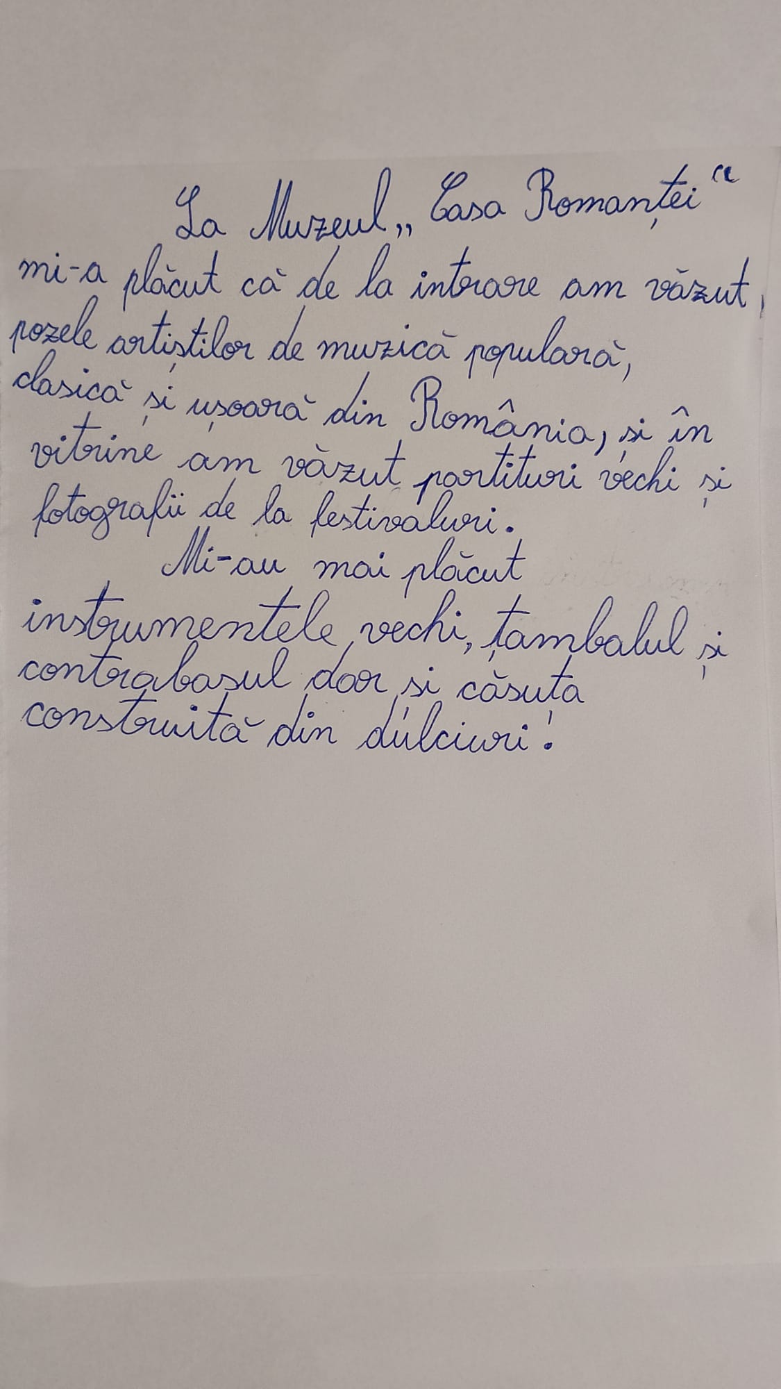 „La muzeul Casa Romanței, mi-a plăcut că de la intrare am văzut pozele artiștilor de muzică populară, clasică și ușoară din România și în vitrine am văzut partituri vechi și fotografii de la festivaluri.Mi-au mai plăcut instrumentele vechi, țambalul și contrabasul dar și căsuța construită din turtă dulce”.